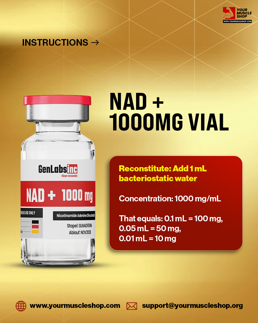 NAD + 1000 mg (nicotinamide Adenine Dinucleotide) Vial – (with Bacteriostatic Water) – Genlabs